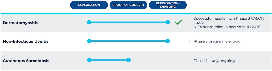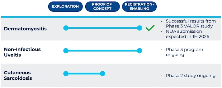Priovant intends to file a New Drug Application (NDA) in early 2026 for brepocitinib in dermatomyositis (DM), a highly debilitating inflammatory condition of the skin and muscles. Brepocitinib recently delivered the first ever positive 52-week placebo-controlled trial in DM, demonstrating clinically meaningful and statistically significant improvement on measures of muscle disease, skin disease, and steroid-sparing. More details of the results are available here.